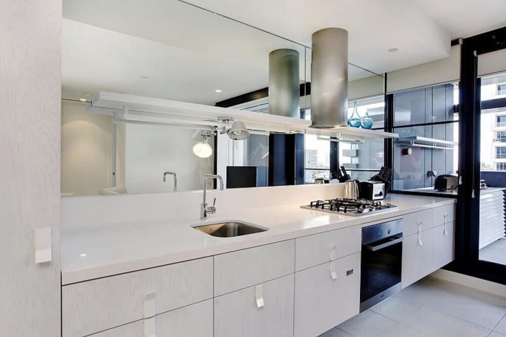Featuring a modern & stylish kitchen with white Caesar-stone benches, glass splash backs, premium stainless-steel appliances and ample storage cabinetry.